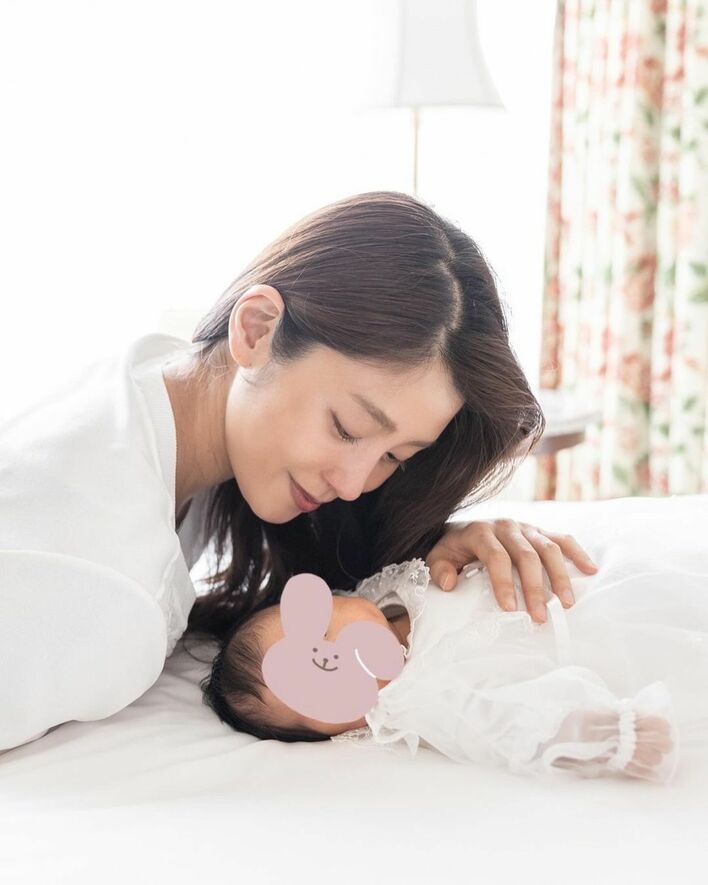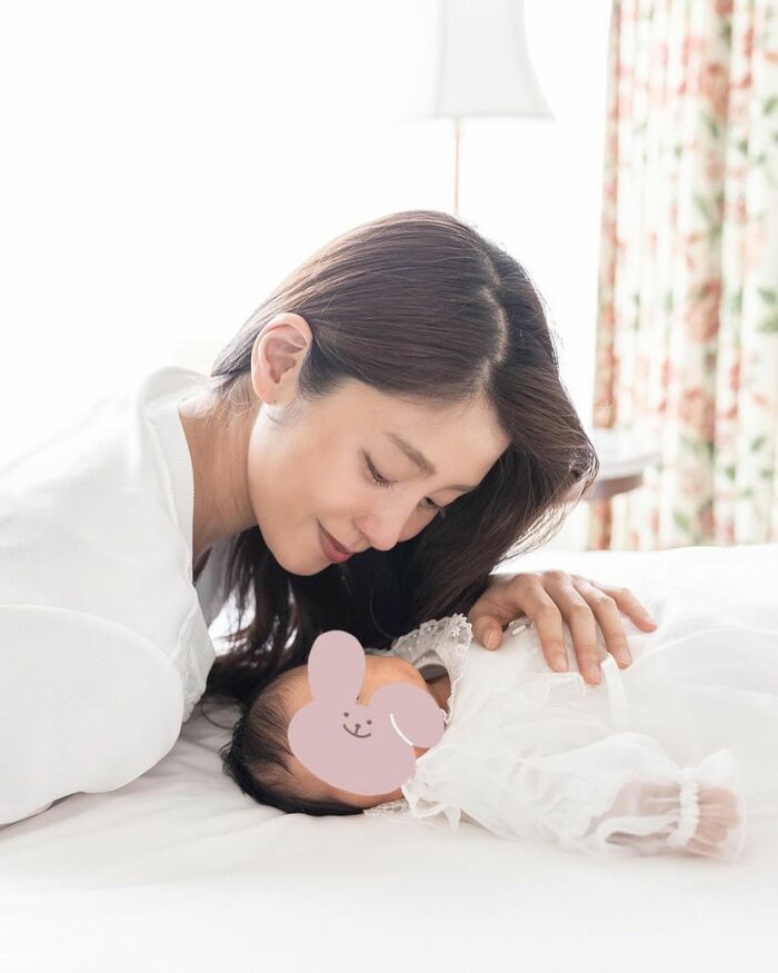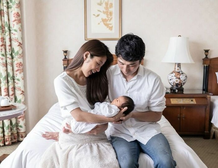 夫の蒲生尚弥さんと一緒にベッドに座り、赤ちゃんを抱き抱える家族3ショットの写真では、赤ちゃんをあやすような岡副さんの姿が写し出されています。