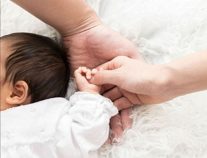 ベッドで寝る赤ちゃんの横で3人の手が重なり合う様子の写真も。