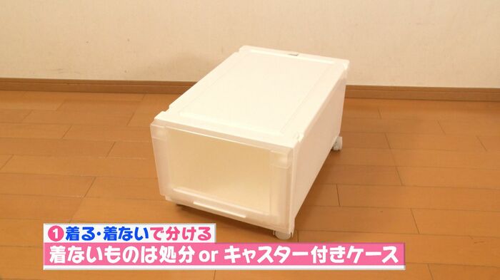 着るものは、形を揃えたハンガーに。あまり着ないものは、奥にすぐ移動できるキャスター付きの収納ケースに分けていきます。
