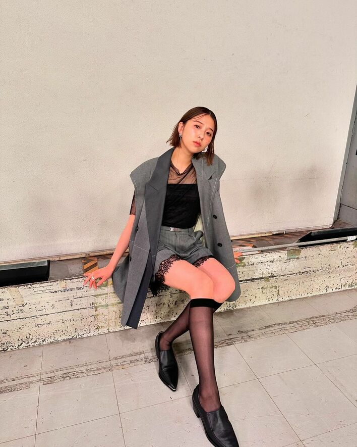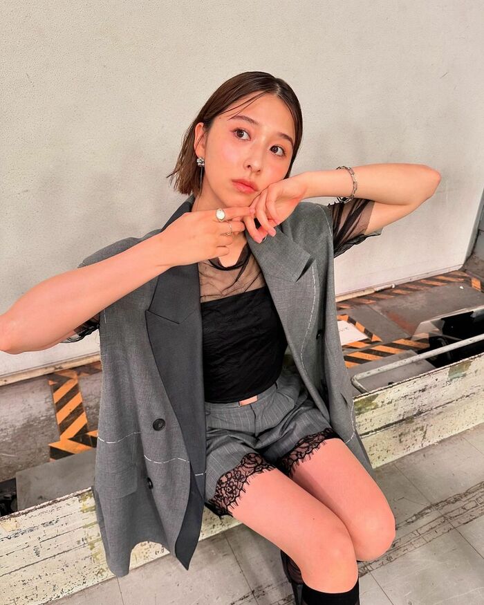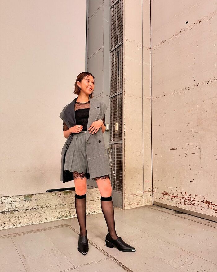 玉井さんは今回の投稿で、前髪を流したヘアスタイルに、透け感のある黒のトップスにグレーのベストを合わせ、黒のレースがついたグレーのショートパンツを着用したシックな衣装姿を公開!