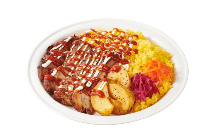 イエローライスの上に、オレガノやチリパウダーなどのスパイスで下味を付け焼き上げたチキンをスライスしてトッピングし、サルサソースや、ほのかに酸味を効かせたヨーグルトソースを合わせています。