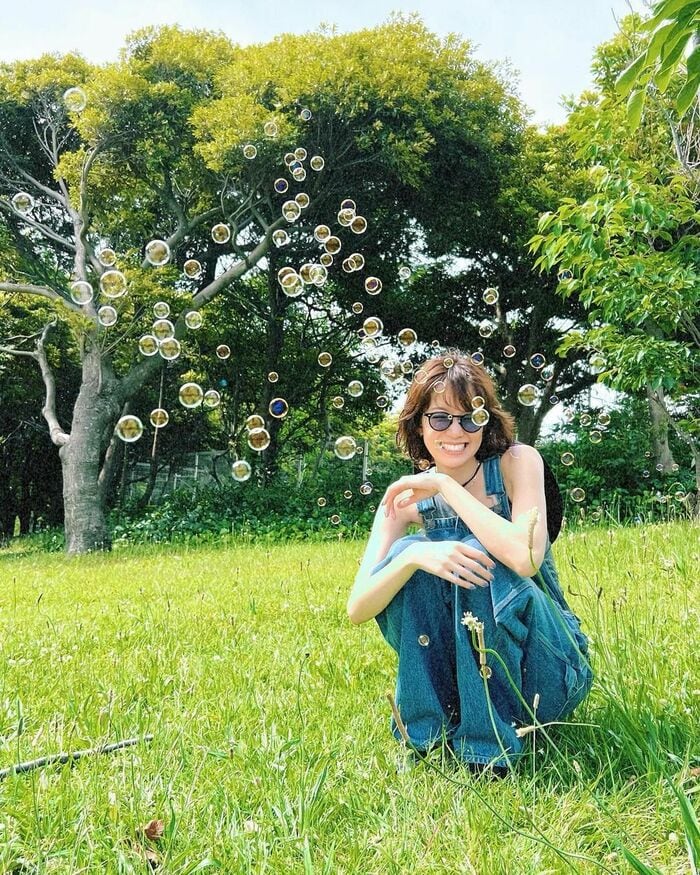 さらに別の写真では、芝生の上にしゃがんだ佐藤さんが、シャボン玉と一緒に写るフォトジェニックな姿も公開。