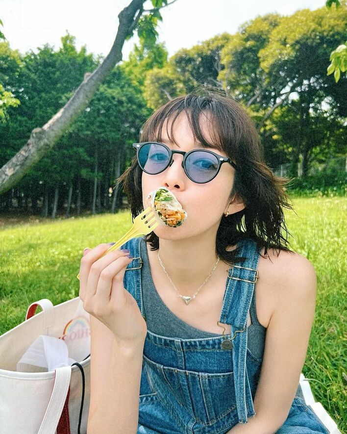 投稿された写真では、デニムのオーバーオール姿でサングラスをかけた佐藤さんが、生春巻きを食べながらカメラを見つめる姿や