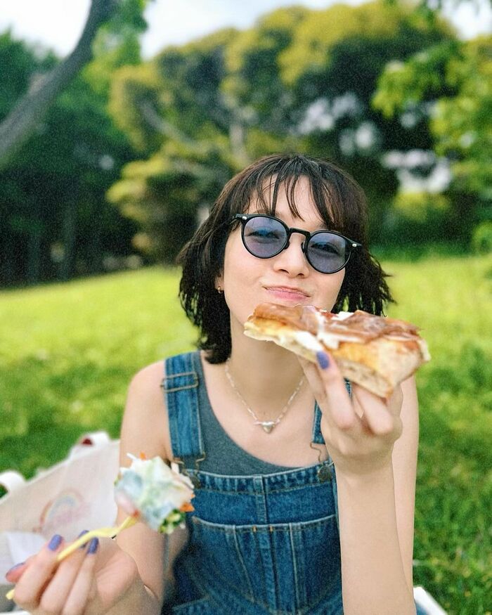 天気の良い日にピクニックへ出かけたことを報告し、ピザを食べる“もぐもぐショット”やシャボン玉で遊ぶ写真を公開しました。