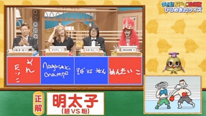 マリアンさんは「nagasaki chanpo」、大木凡人さんは「そばvsうどん」と回答して不正解。天龍源一郎さんとJAGUARさんが正解でした。