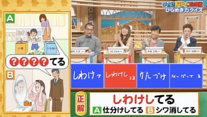 蝶野正洋さんは「しわけっ」、赤塩正樹さんは「かたづけ」、ロミ・山田さんは「ひっぱてる」と回答し不正解。白石まるみが正解でした。