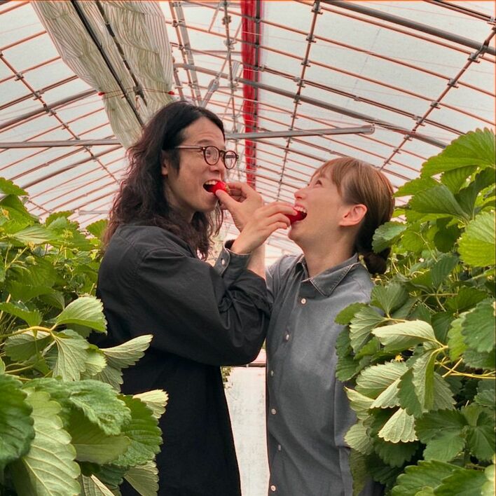 投稿された写真では、庄司さんと藤本さんが向かい合って、お互いの腕をクロスさせながらイチゴを食べるという独特な食べ方を披露!