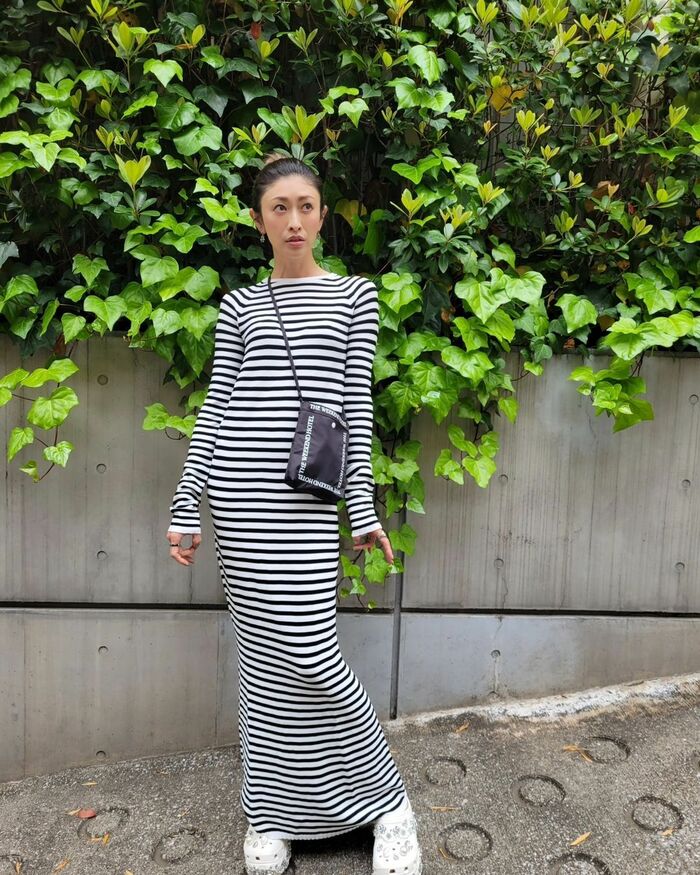 投稿された写真には、体のラインにフィットした白のボーダー柄のワンピース姿を披露!