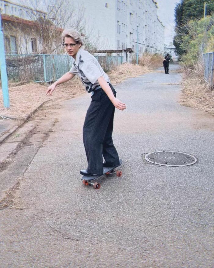 さらに「イケおじスケーター」と題した写真では、ハイウエストのズボンに、Tシャツ、黒メガネをかけた“イケおじ”姿で、真剣な顔でスケーターに乗った姿も!