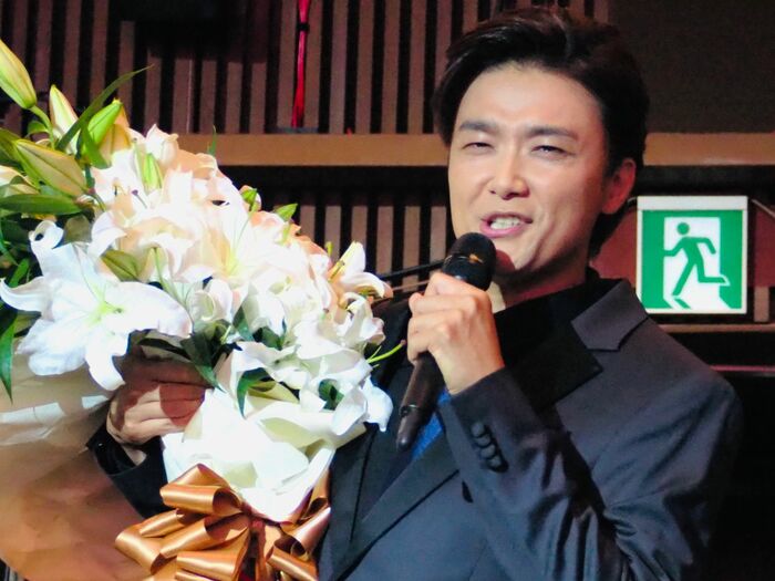 そこへ、客席後方の扉からユリの花束を抱えた井上さんがサプライズで登場。通路をゆっくりと歩いて、ステージに上がる際には堂本さんが手を取ってエスコートを。井上さんは「姫になった気分」とはにかみました。