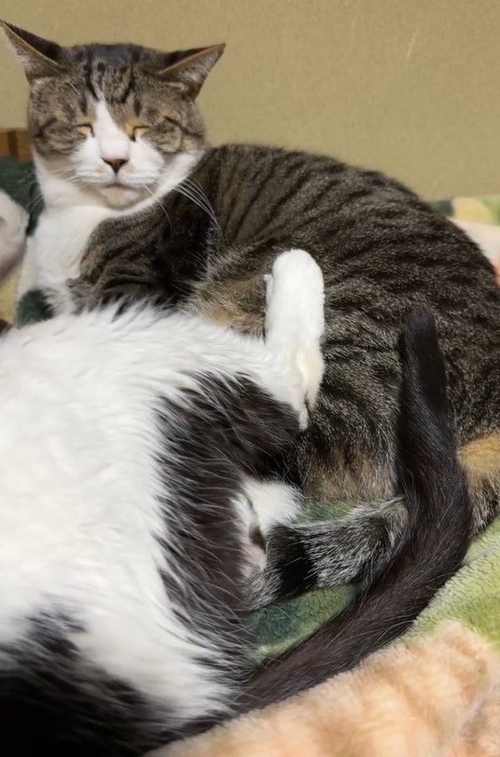 別の日の投稿では、一緒に暮らしているにゃんこの後ろ足が思いっきり「富士雄」くんのボディに入っていますが、「富士雄」くんはそんなことはお構いなし!