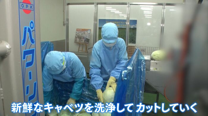 ここでキャベツをカットしています。新鮮なキャベツを洗浄してカットしていきます。