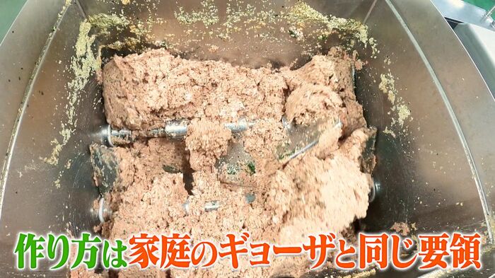 餃子の主な材料は、キャベツとニラ、シャキシャキの玉ねぎ、そしてジューシーな豚肉と鶏肉。これらの具材と調味料と混ぜ合わせるという手順自体は家庭で手作りする場合とほぼ同じ流れなのですが、ここにも「永久改良」のポイントが。
