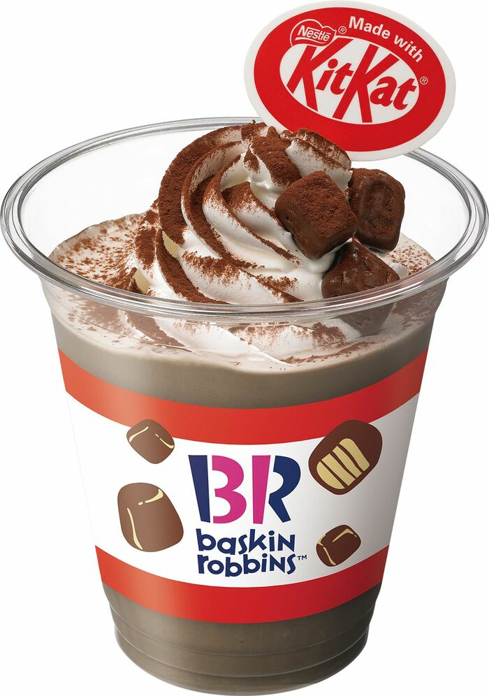 「トリプル チョコレート ブレイク」とミルクをミキシングし、ホイップクリームにココアパウダーと小さな「キットカット」3個がトッピングされており、チョコレート好きも大満足です。
