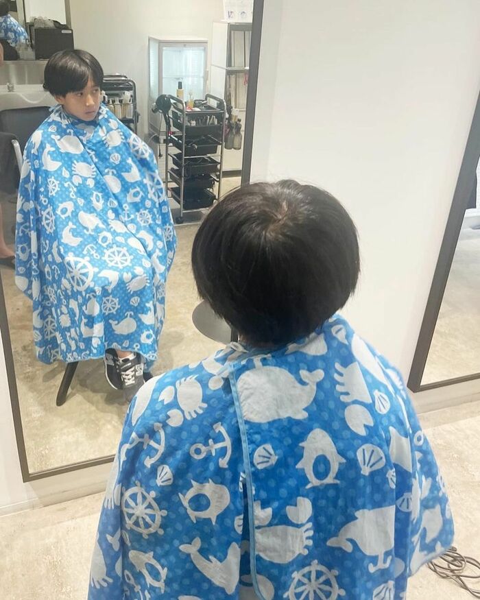 散髪前の写真では、青のカットクロスを着けて座る新之助さんの姿が!