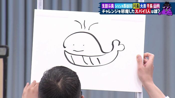 大きな口が特徴的なイラストで、大吉さん、大悟さん、川島さんの回答「ワニ」にはみな納得しましたが、一人「くじら」と答えた長谷川さんはさすがに怪し過ぎるという空気に。