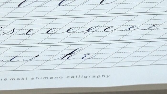 呼吸をすることも意識しながら「紙の傾斜の線と並行になるように書くと傾きが確認できる」と島野先生からポイント教えてもらい「k」を書き進めていきます。