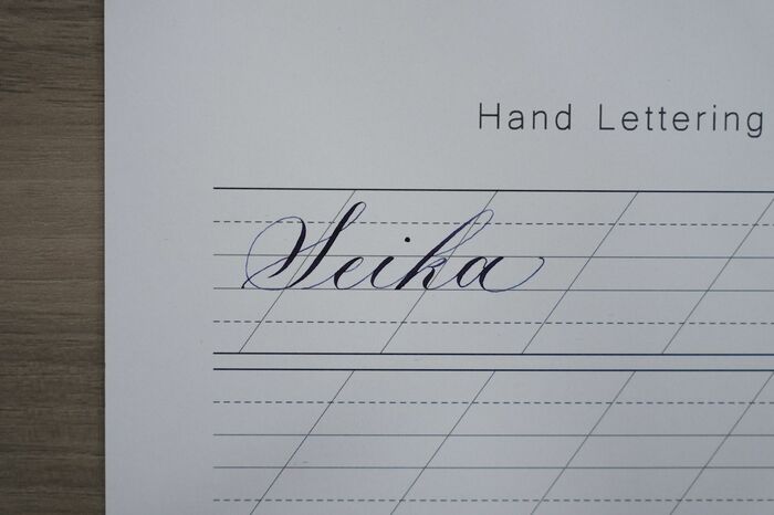 「力が入ってしまう」と苦戦しながらも、自分の名前である「Seika」をかっこよく書くために何度も練習を重ね、筆圧や傾斜もそろっていてバランスよく書けるまでに上達!