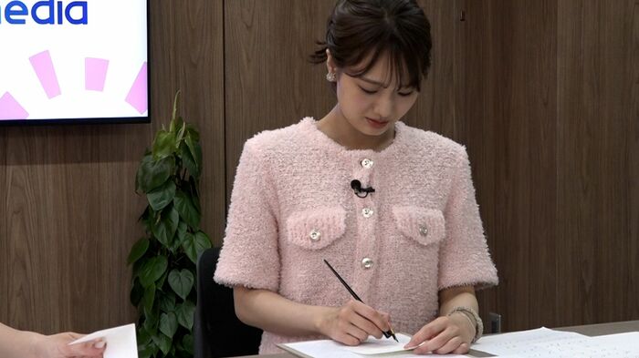 気合を入れ、途中までうまく書けていましが、夢中になりすぎて、また呼吸を忘れる井上アナ。