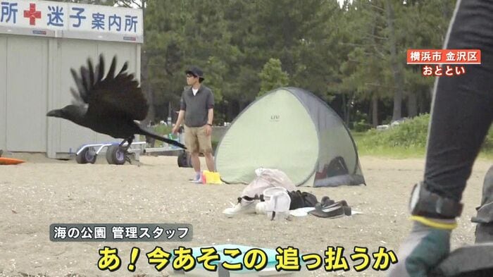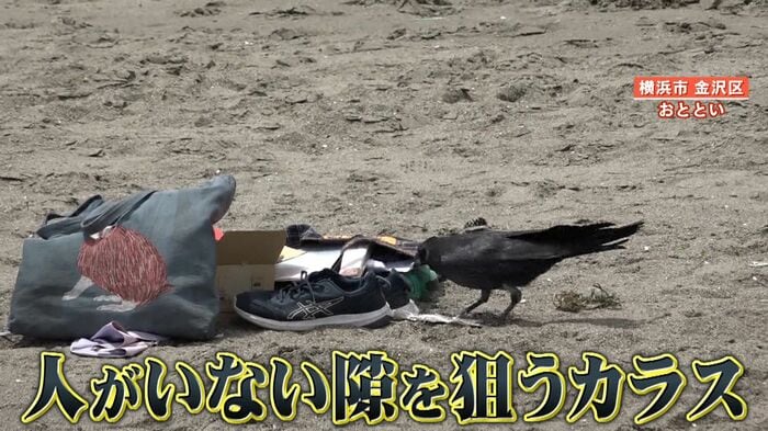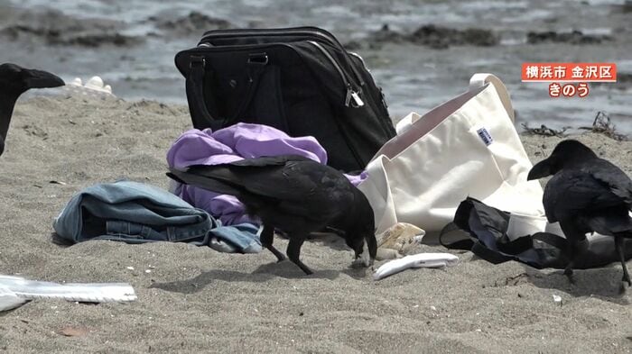 他にも人がいない隙を狙い、荷物などを物色するカラスの姿があちこちで見られました。