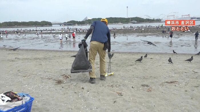 潮干狩りに多くの人が夢中になっている中、砂浜のレジャーシートの多くは無人に。すると…
