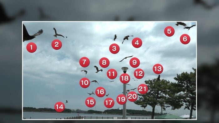 バーベキュー会場の上空を旋回する“トビ”。画面に映るだけでも21羽が確認できました。