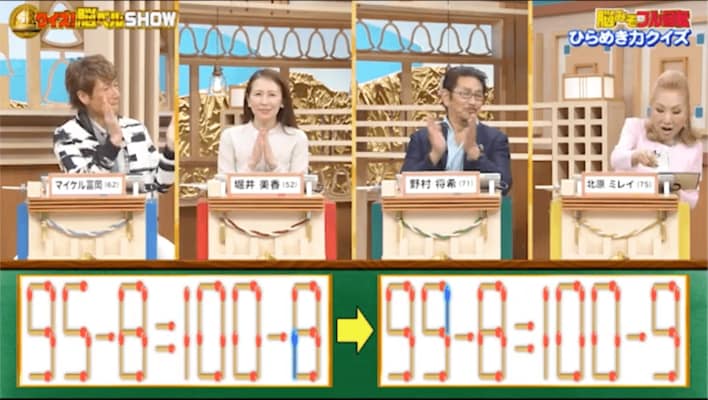 「95-8=100-8」の式から、マッチ棒を1本だけ動かして正しい式にしてください。