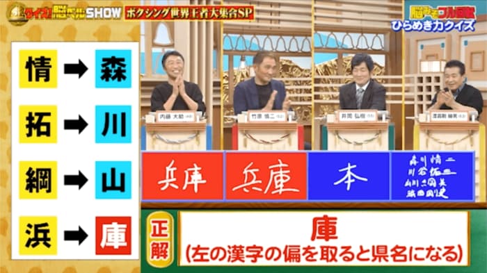 正解は「庫」。左側の漢字の偏を取り、右側の漢字と合わせると県名になります。