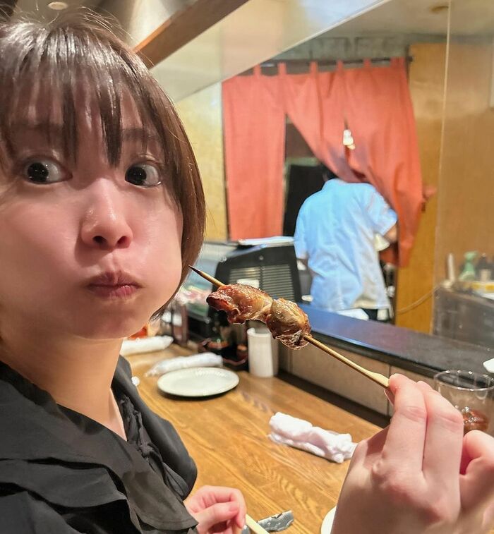また、おいしそうな焼き鳥を撮った写真とともに、自身の食べている様子も公開しています。