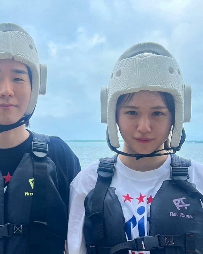 食事の様子だけでなく、マリンアクティビティをしたことも報告。ヘルメットをかぶって、カメラをじっと見つめるシュールなショットを見せています。