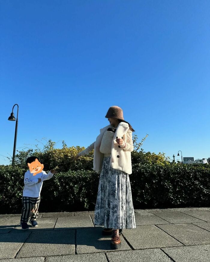 家族でお出かけしたのか、舟山さんが息子に手を伸ばしている姿も。