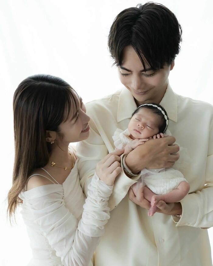 娘のベビー服に合わせて、舟山さんは白いオフショルのトップスで、旦那さんも白のシャツを着たコーディネートになっていて、写真からも家族のあたたかな雰囲気が感じられます。