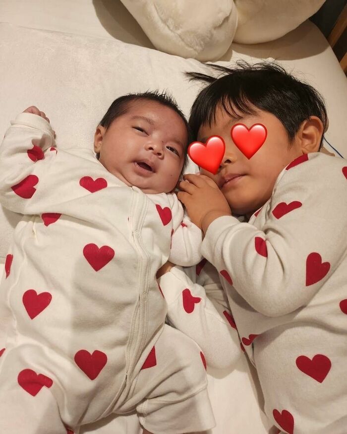 同じ赤いハート柄の服を着た息子と娘が、寄り添いながらゴロンと寝ているほほ笑ましいショットや…