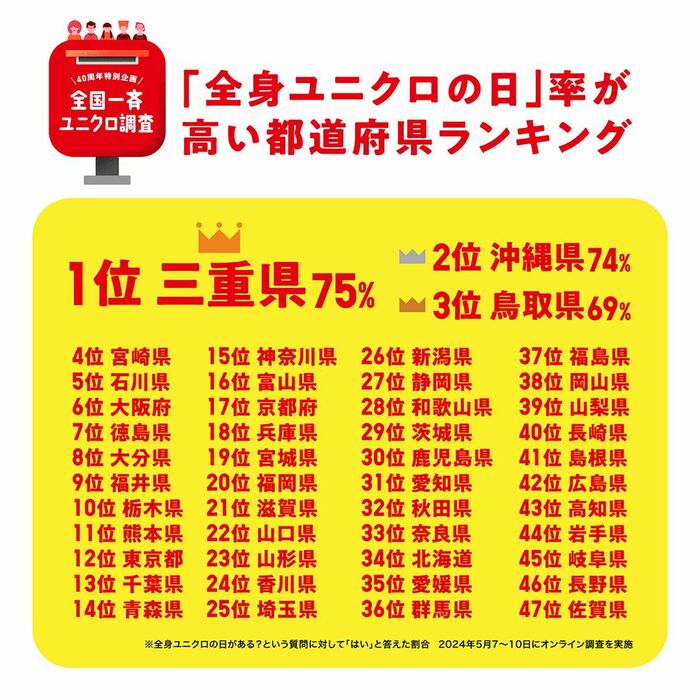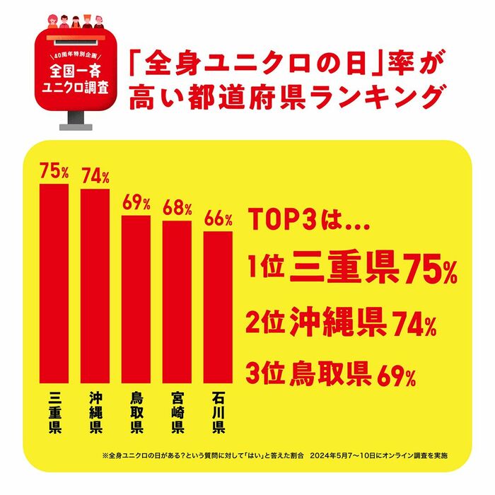 1位は「三重県」で、約7割の人が「全身ユニクロコーデ」をしている日があると回答。最もユニクロを愛しているのは三重県の人たちであることがわかりました。