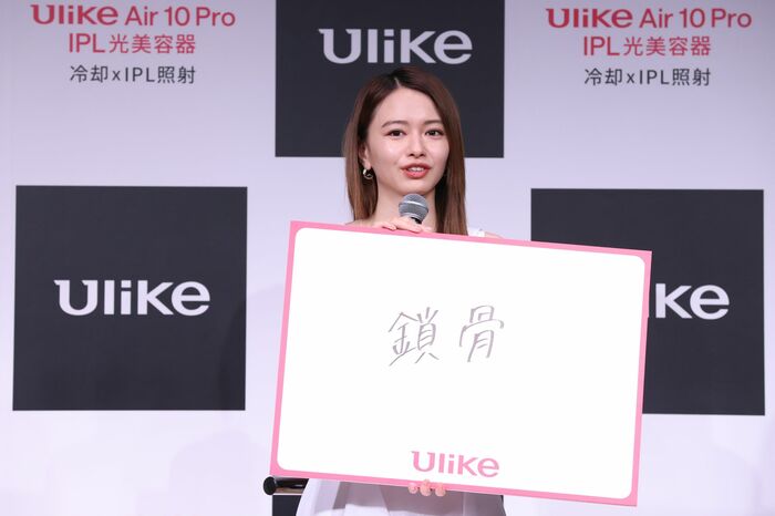 また、ブランド名「Ulike」にかけて「自分の体で好きなパーツ」を「鎖骨」とフリップで回答。