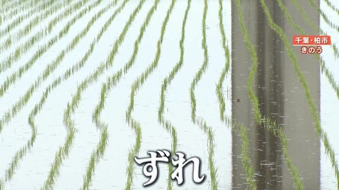 どこまでもキレイにまっすぐなはずの田植えの稲の列に、「ずれ」が発生しているんです。