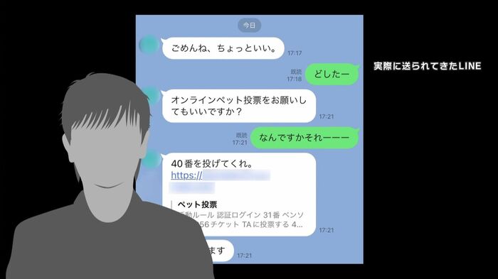 その他にも、突然友人から「オンラインペット投票をおねがいしてもいいですか?」といったメッセージが送られてきたが、実際には友人のLINEが乗っ取られており、友人本人が送ったものではなかったというケースも。