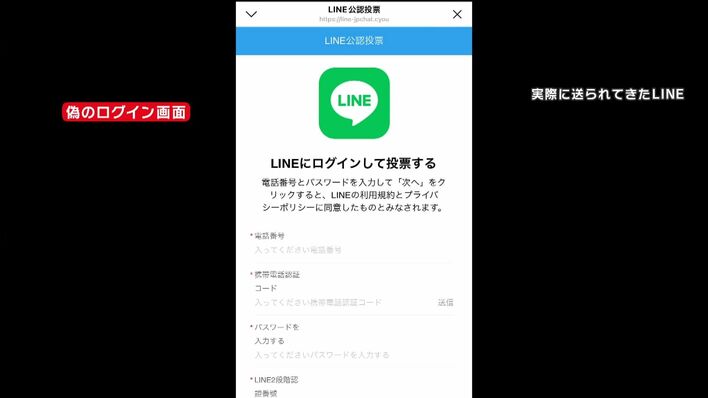 さらに、送られてきたURLを開くとそこには「LINE公認投票」「LINEにログインして投票する」などと記載されたログイン画面が現れ、電話番号やパスワードを入力する欄がありました。