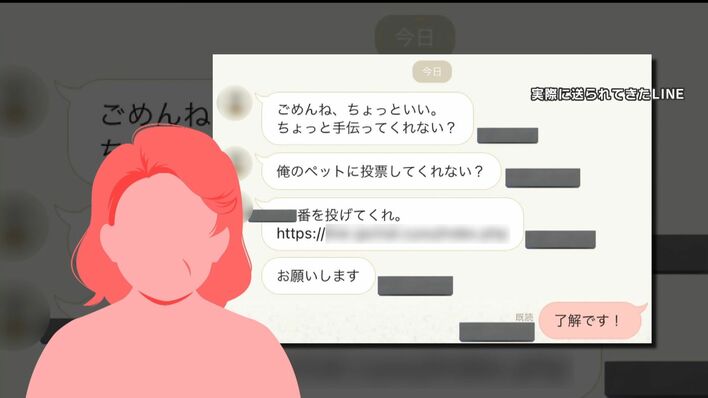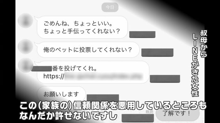 ある女性に叔母から送られてきたのが、「ごめんね、ちょっといい」「ちょっと手伝ってくれない?」「俺のペットに投票してくれない?」といったメッセージとURL。叔母なのに“俺”という言い方をしていたことや、言葉遣いがなれなれしかった点から怪しいと思ったということです。