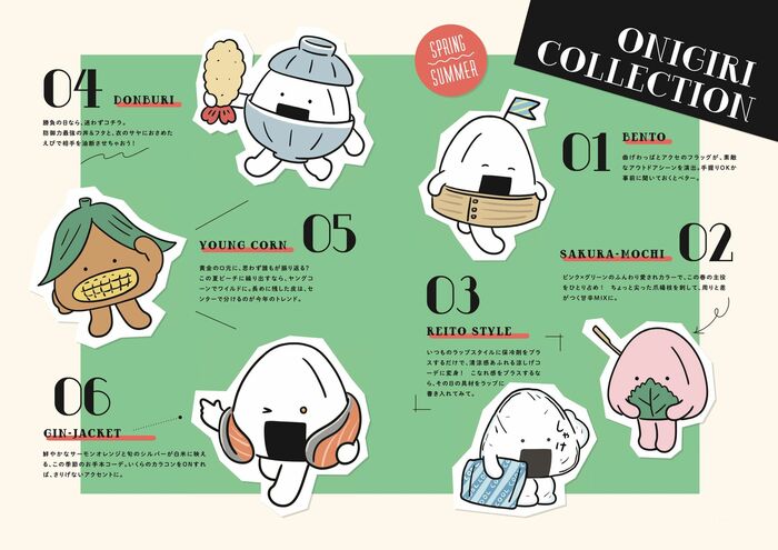 また「ONIGIRI COLLECTION」と題して、ラップされた「おにぎり」やサーモンを身にまとったおしゃれな「おにぎり」などがファッション雑誌風に描かれています。