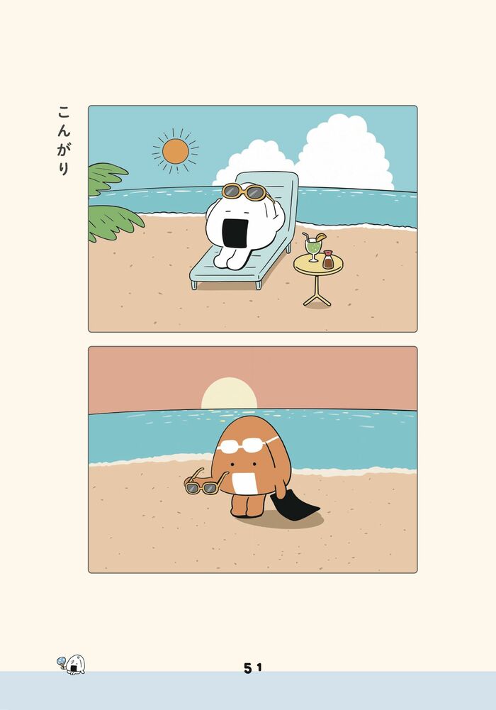 タイトル『こんがり』では、砂浜で太陽の光を浴びた「おにぎり」が目を覚ますと、のりとサングラスの形をした日焼け後ができていました。