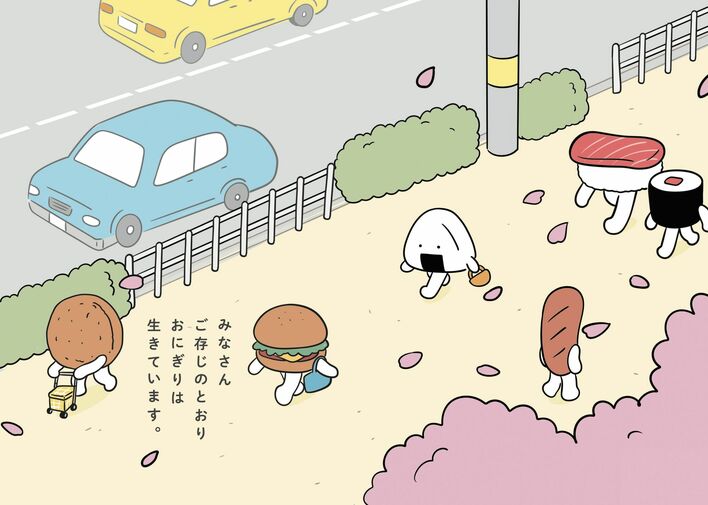 「みなさん ご存じのとおり おにぎりは 生きています。」と書かれたイラストには、ハンバーガーやおすしが歩く道に「おにぎり」の姿が!