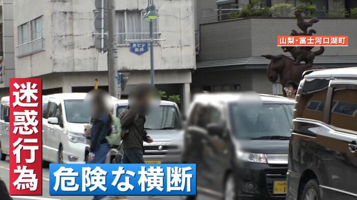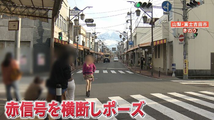 市は安全に撮影してもらうため、警備員を配置し観光客の誘導を行っていますが、赤信号を横断し、途中でポーズを決める女性。