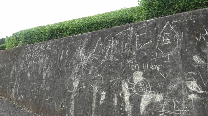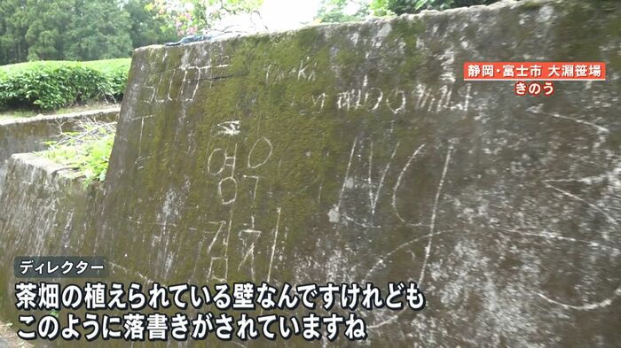 茶畑の植えられている壁なんですけれども、このように落書きがされていますね。
