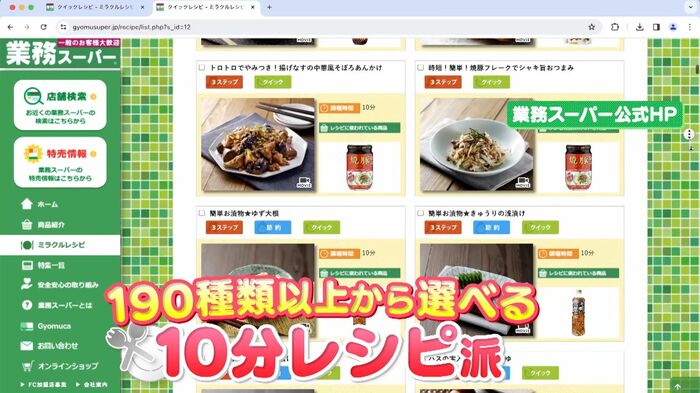 一方で、業務スーパーの公式サイトでは10分以内で作れちゃう時短レシピを紹介していて、190種類以上ものメニューが選べます!