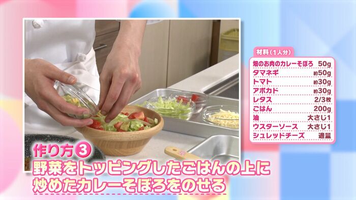 作り方③ 野菜をトッピングしたごはんの上に炒めたカレーそぼろをのせる
