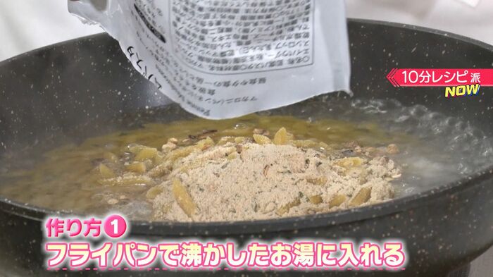 そのため、フライパンで沸かしたお湯に袋の中身をそのまま投入、あとはベーコンや玉ねぎなど、お好みの具材を加えるだけで簡単に本格パスタが作れてしまう超便利商品。