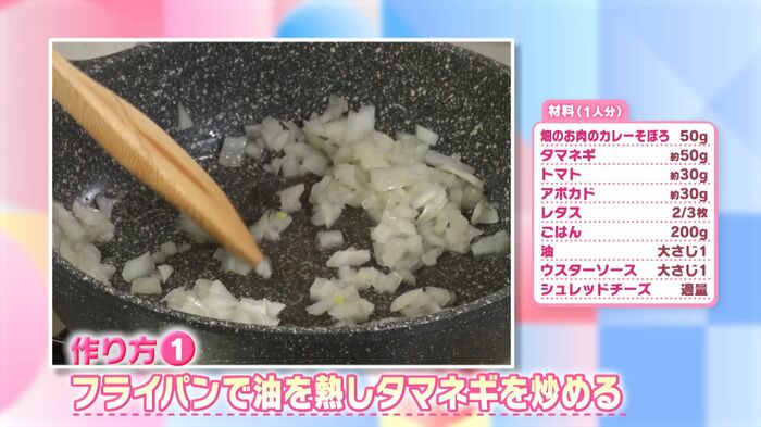 作り方① フライパンで油を熱し、みじん切りにしたタマネギを炒める