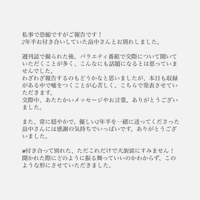 破局を発表するに至った経緯に関し、「週刊誌で撮られた後、バラエティ番組で交際について聞いていただくことが多く、こんなにも話題になるとは思っていませんでした」と本音を綴ったのち、「わざわざ報告するのもどうかなと思いましたが、本日も収録がある中で嘘をつくことが心苦しく、こちらで発表させていただきます」と現在の心境を明かしました。