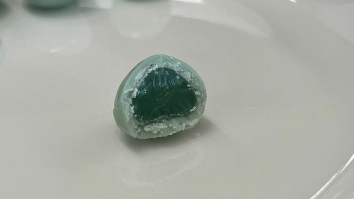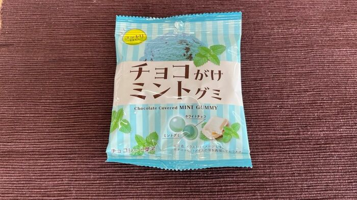 外側はチョコでコーティングされていて、チョコの内側にミントのグミが入っているという構造のチョコミント味のグミ。